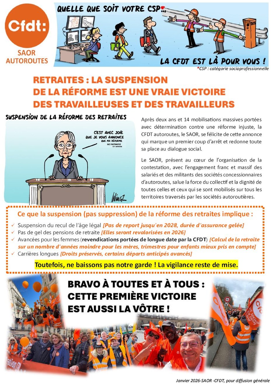 Vous trouverez ci-dessous et en pièce jointe, le tract de la part du Syndicat des Autoroutes et Ouvrages Routiers (SAOR-CFDT) sur la suspension de la réforme des retraites.