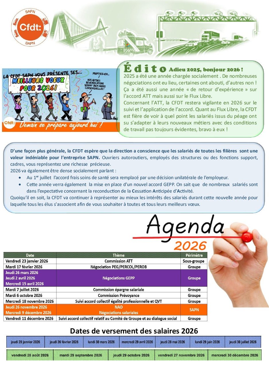 Accueil > Actualités > Dossiers à la Une > Autoroutes - SAOR Autoroutes SAPN : l’agenda social 2026 Publié le 22 janvier 2026 Vous trouverez ci-dessous et en pièce jointe, le tract de la part de la CFDT SAPN qui présente l’agenda social 2026. – – – – – – – – – – – Documents Tract SAPN-CFDT - Agenda social 2026