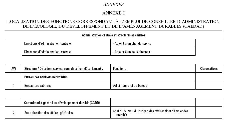L’annexe 1 concerne la localisation des fonctions correspondant à l’emploi de conseiller d’administration de l’écologie, du développement et de l’aménagement durables (CAEDAD).