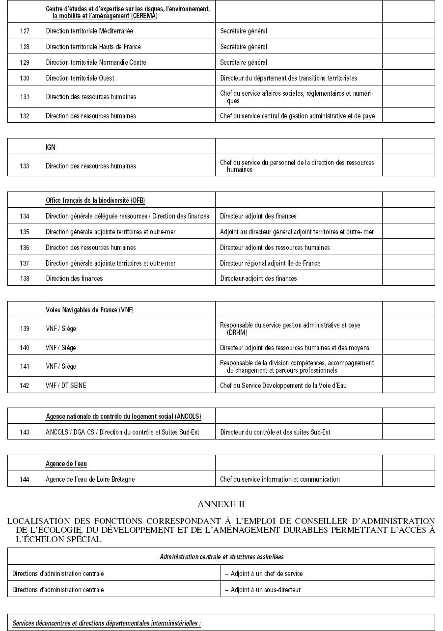 L’annexe 2 concerne la localisation des fonctions correspondant à l’emploi de conseiller d’administration de l’écologie, du développement et de l’aménagement durables permettant l’accès à l’échelon spécial.