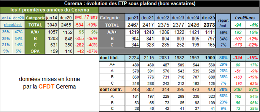 Bonjour de la CFDT Cerema qui vous livre son tableau synthétique sur l’évolution des effectifs, à l’échelle de l’Établissement. Pour le détail de chaque direction, voir en PJ.