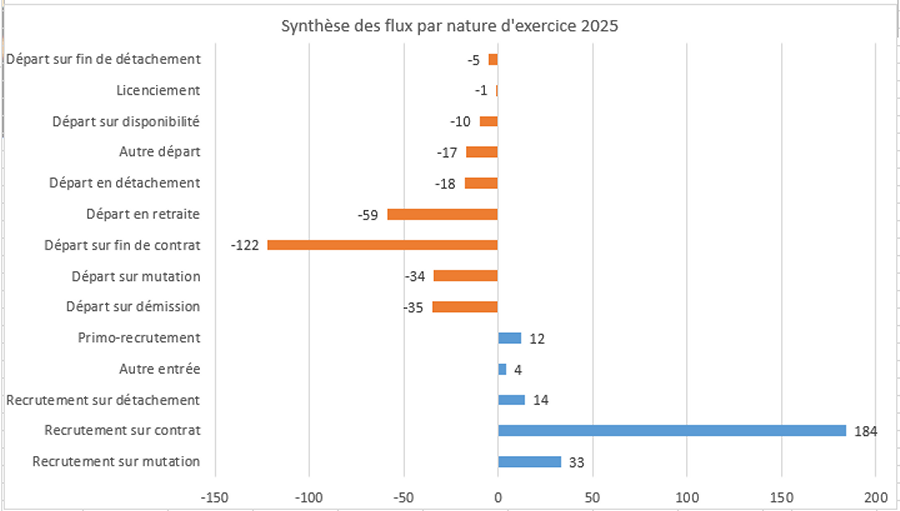 Recrutements : 59 pour les fonctionnaires (primo, mutation, détachement) ; à comparer aux 184 recrutements sur contrat, dont 73 en janvier (dont quelques dizaines de reconduction de contrats courts arrêtés le 30 décembre 2024).