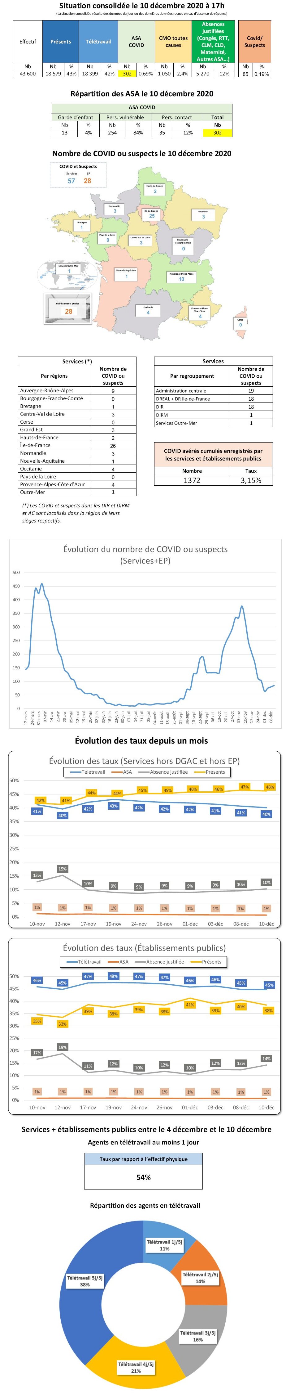 Vous trouverez en pièce jointe la fiche (état au 10/12) sur le suivi des effectifs et le nombre d’agents atteint de COVID-19 (ou suspects) dans les services et établissements publics de notre champ ministériel (Par régions).