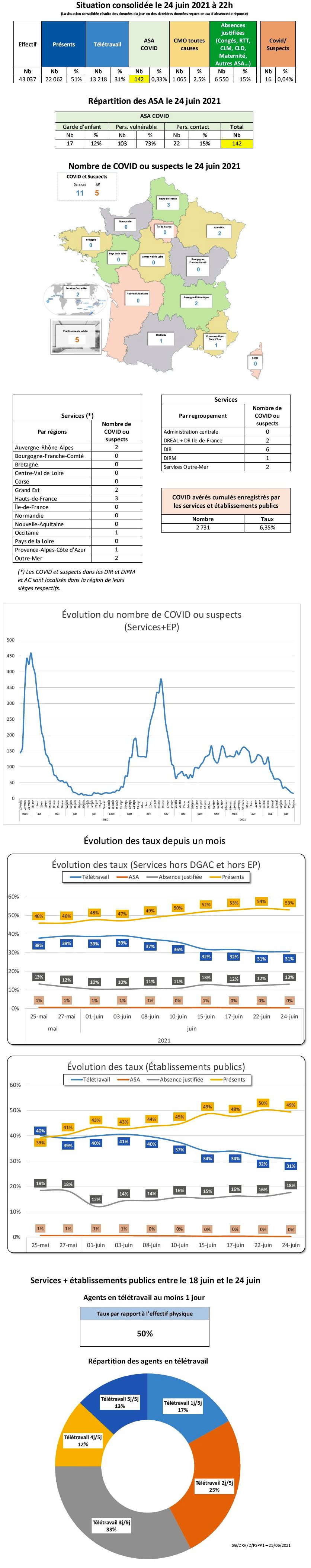 Vous trouverez en pièce jointe la fiche (état au 24/06) sur le suivi des effectifs et le nombre d’agents atteint de COVID-19 (ou suspects) dans les services et établissements publics de notre champ ministériel (Par régions).