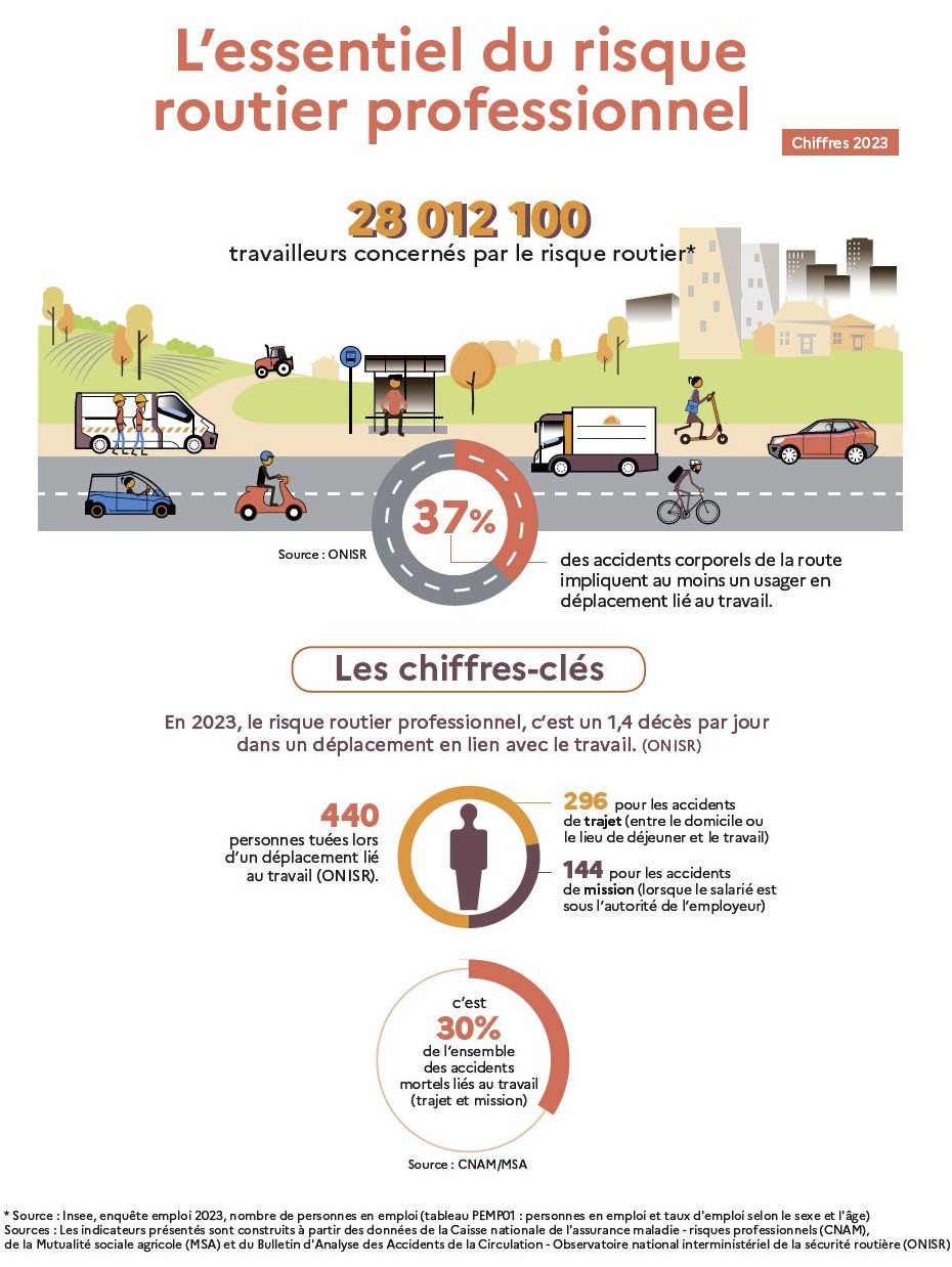 Le ministère du Travail, le ministère de l’Intérieur, ainsi que la Caisse nationale d’assurance maladie (CNAM), la Mutualité sociale agricole (MSA), et Santé publique France, publient l’Essentiel du risque routier professionnel, une infographie présentant les chiffres clés relatifs à ce risque majeur. En 2023, 440 personnes (en 2024, 424 personnes) ont ainsi perdu la vie lors d’un trajet routier en lien avec le travail (données ONISR).