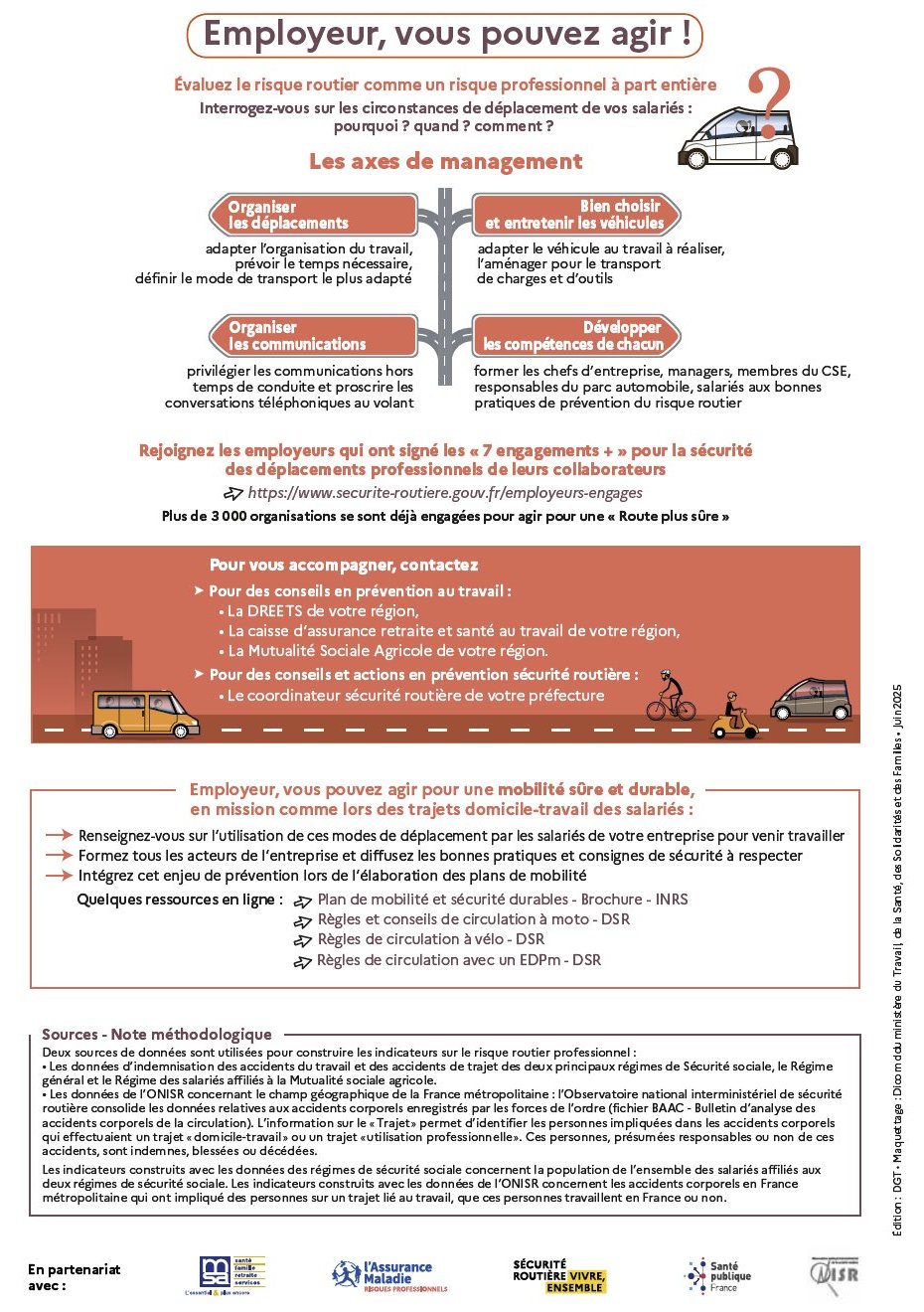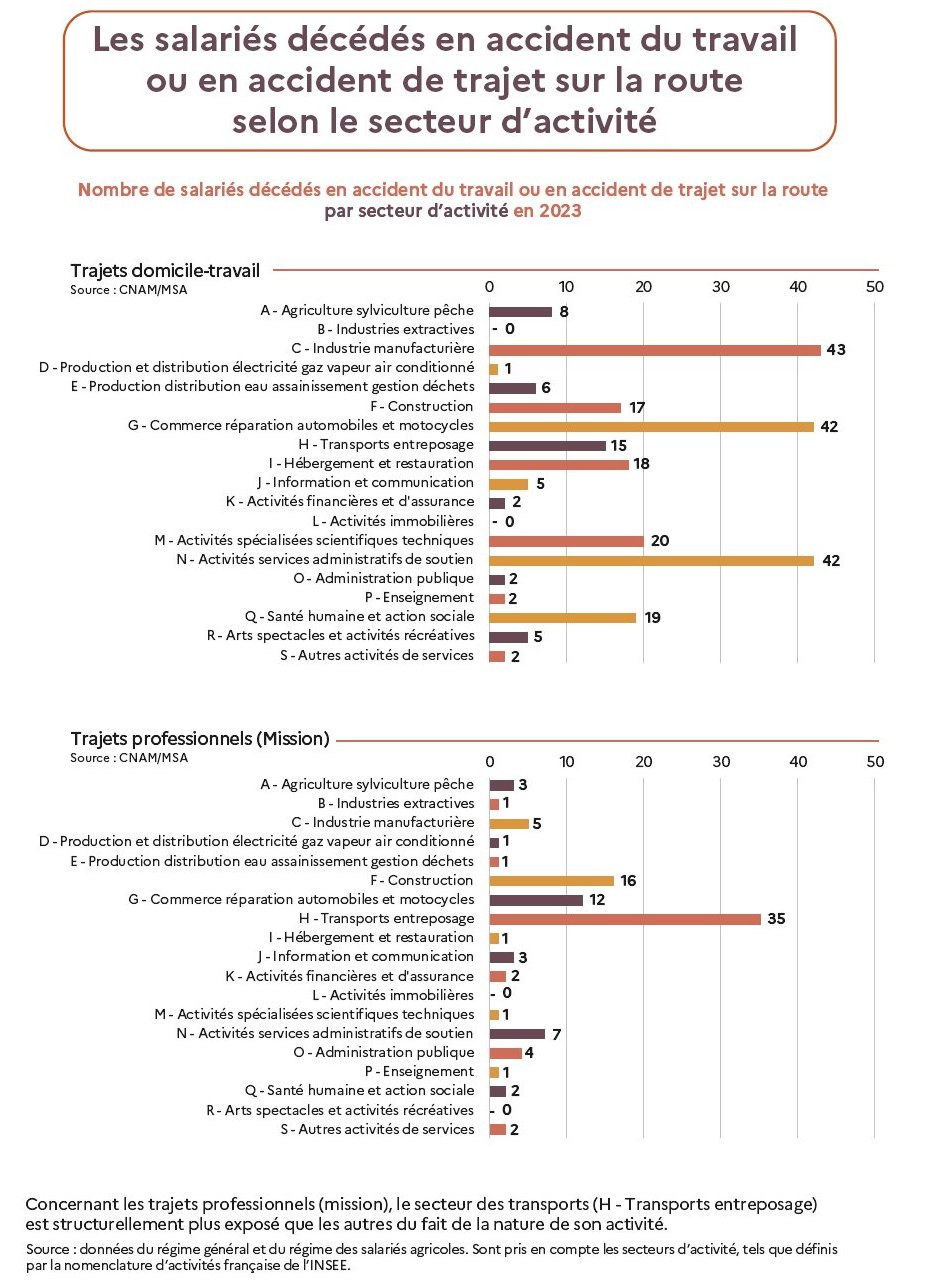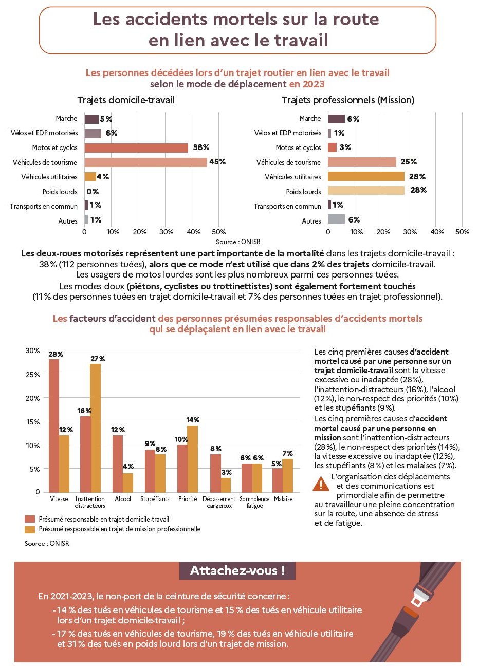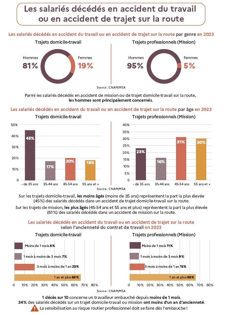Les données d’indemnisation du régime général et du régime agricole de sécurité sociale font apparaître que pour l’année 2023, les salariés décédés en accident du travail (mission) ou en accident de trajet (domicile-travail) sur la route représentent 30 % de l’ensemble des accidents mortels liés au travail. Outre les décès, ces accidents peuvent avoir des conséquences graves pour la santé des salariés. Ils sont aussi facteur de désorganisation et coûts supplémentaires pour les entreprises.