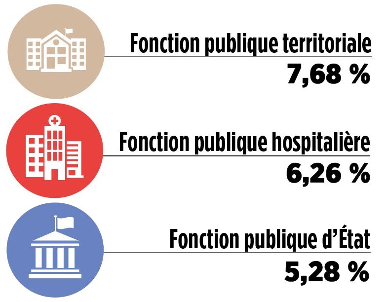 Dans le détail la fonction publique territoriale atteint 7,68 %, la fonction publique hospitalière 6,26 %, tandis que la fonction publique d’État reste en retrait avec 5,28 %.