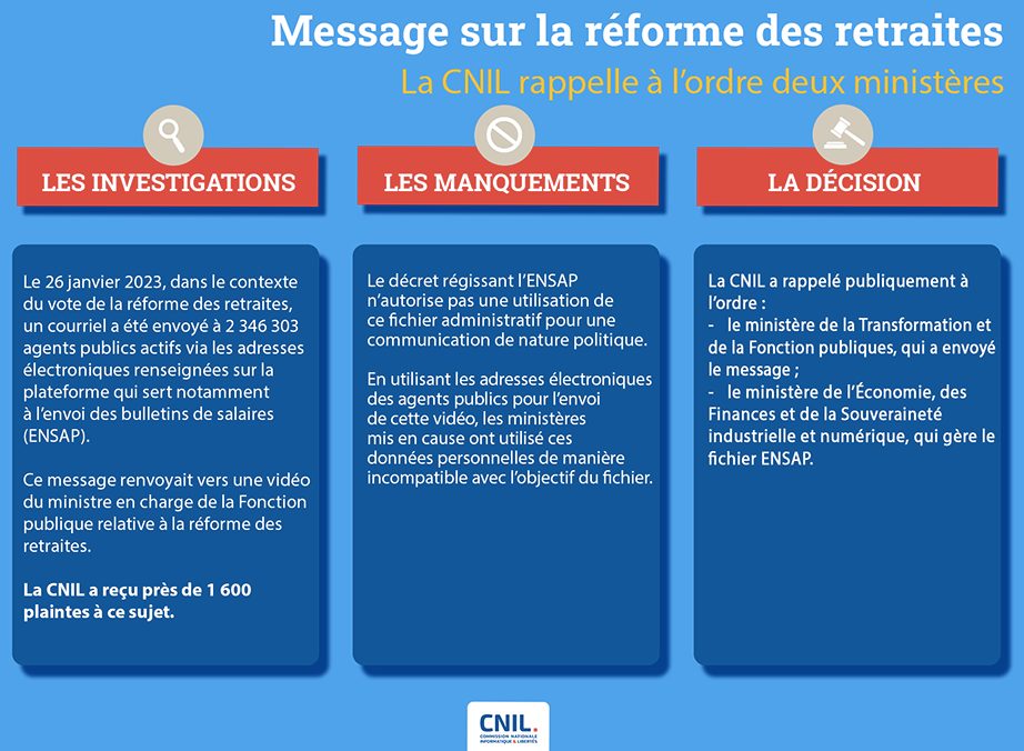 La CNIL (Commission nationale de l’informatique et des libertés) vient de rendre ses conclusions dans l’affaire du courriel vantant la future réforme des retraites, adressé à tous les agents publics de l’État par le Ministère transformation et de la fonction publiques : il y a bien eu détournement illégal de fichier à des fins de communication politique !