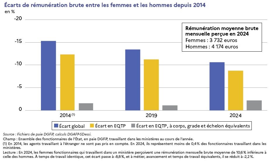 La Direction Général de l’Administration de la Fonction Publique (DGAFP) a publié ses « Stats Rapides » de mars 2025 avec comme sujet : les écarts de rémunération brute entre les femmes et les hommes fonctionnaires dans les ministères en 2024.
