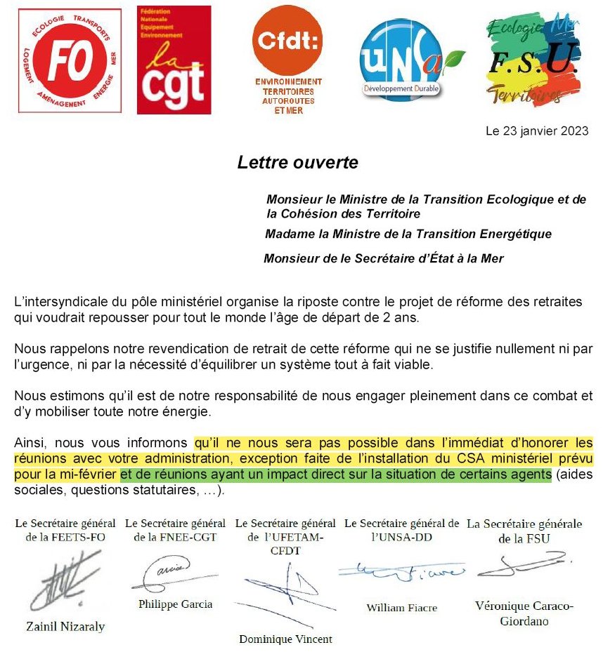 - Article du 15-01-23 : Retraites : Ensemble, en grève, en actions, en manifestations (MTECT/MTE/Mer)