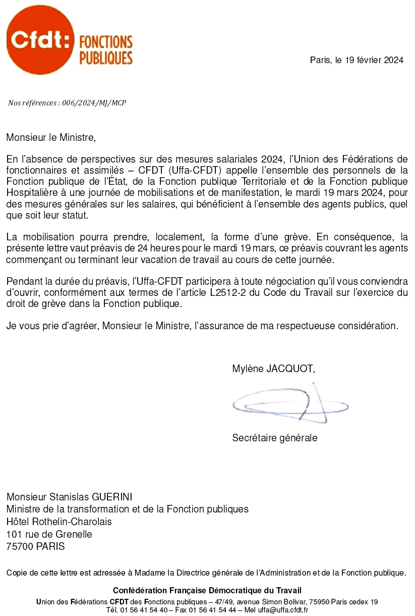 La CFDT Fonction publique a écrit au ministre Stanislas Guérini pour déposer un préavis de grève, qui couvre les agents des trois versants de la Fonction publique.