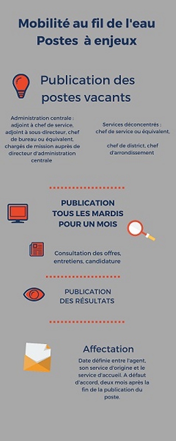 - Pour les postes à enjeux, la procédure dite mobilité “au fil de l’eau” est mise en œuvre tout au long de l’année avec une publication tous les mardis. En administration centrale, les postes à enjeux sont : adjoints à chefs de service, adjoints à sous-directeurs ou équivalent, chefs de bureau ou équivalent, chargés de mission auprès de directeur ou directrice d’administration centrale et en services déconcentrés : chefs de service ou équivalent, chefs de district, chefs d’arrondissement.