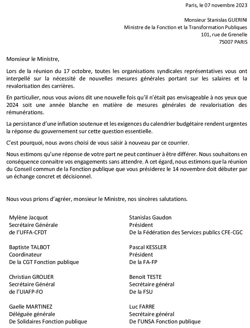 Courrier du 7 novembre 2024 au ministre de la Fonction Publique :