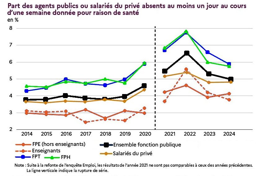 En 2024, 5 % des agents ont été absents au moins un jour pour raison de santé au cours d’une semaine donnée — un taux équivalent au privé.