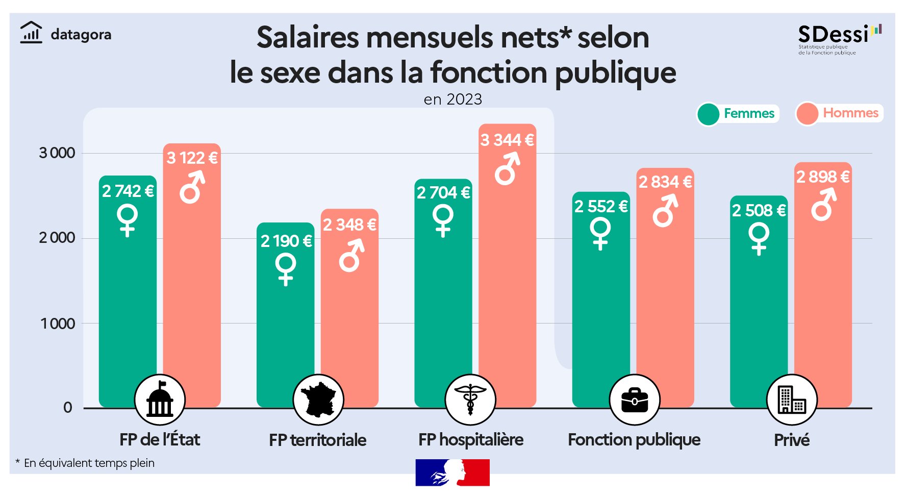 En 2023, le salaire net moyen des agents publics atteint 2 652 € par mois (en équivalent temps plein), en hausse de 4,1 % sur un an.