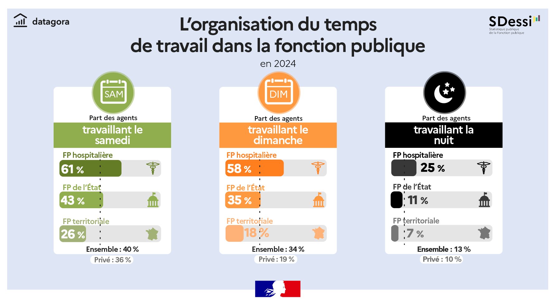 Les agents publics sont nombreux à travailler les samedis et dimanches et la nuit, et dans une proportion plus forte que dans le privé.