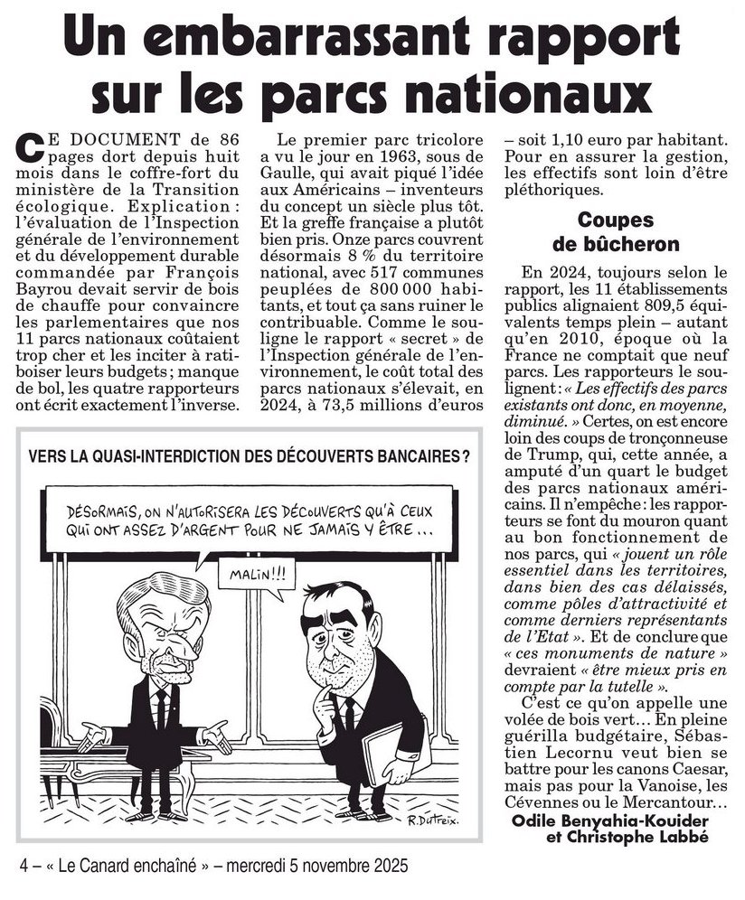 Dans son édition du 5 novembre 2025, Le Canard Enchaîné révèle l’existence d’un rapport resté bien au chaud dans les tiroirs du ministère de la Transition écologique. Commandé pour justifier de nouvelles coupes, ce document de l’Inspection générale de l’environnement conclut au contraire à la bonne gestion et à l’utilité des parcs nationaux. Une conclusion embarrassante pour une tutelle qui peine à reconnaître le rôle essentiel de ces “monuments de nature” — et celui des agents qui les font vivre, souvent avec des moyens toujours plus contraints.